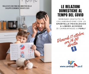 Andrea Spada, psicologo e psicoterapeuta, nel corso del webinar promosso da Cambiapasso “Le relazioni domestiche al tempo del Covid”, ha dialogato con Alessandro Rocchi, Presidente di Assoutenti Emilia Romagna, nell’ambito del servizio di consulenza psicologica gratuita offerta dall’associazione a Forlì e a Bologna (cfr in fondo le modalità per prenotare in totale riservatezza un consulto gratuito).