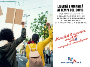 Il prossimo appuntamento in diretta è per mercoledì 17 novembre alle 14.00 con il webinar“Libertà e umanità ai tempi del Covid” tenuto dal dottor Marco Moretti, psicologo e psicoterapeuta.